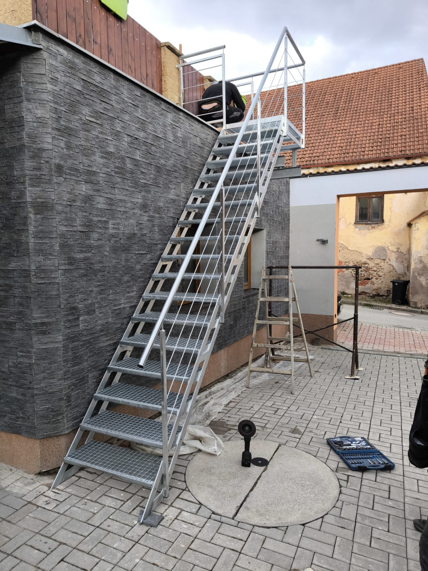 Pevné, bezpečné a praktické. Kovové venkovní schodiště s protiskluzovými rošty a zábradlím na míru.